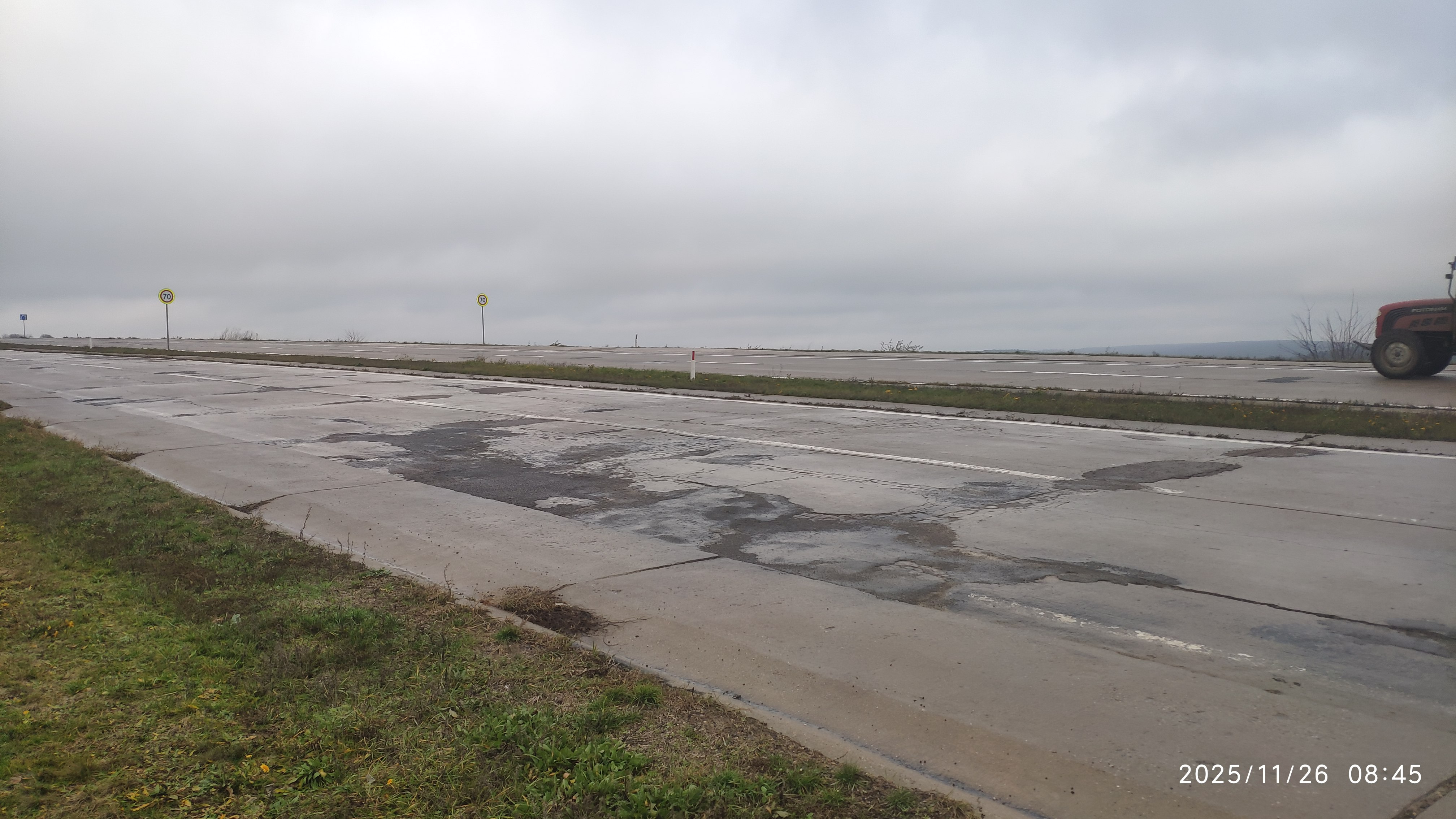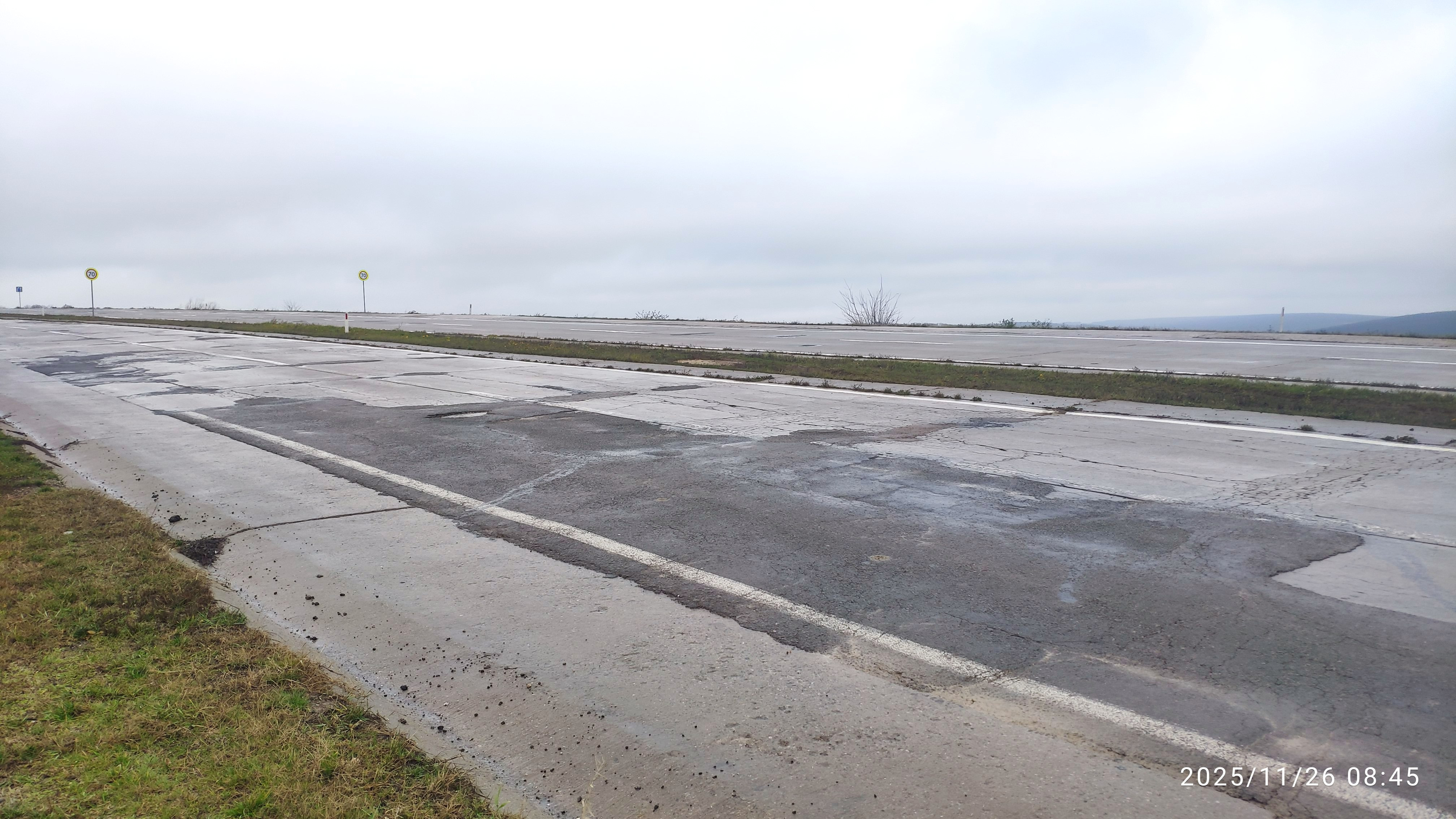 Полос - 4. Всего 34 км от окраины Кишинёва мимо сёл Бачой и Рэзень до села Порумбрей. Покрытие - цементобетон. История строительства дороги. В 1920 году по настоянию военного руководства Бессарабии начато строительство шоссе Кишинев - Бачой - ж/д ст. Злоти, но удалось завершить строительство лишь 14 км дороги от Кишинева до Бачоя и работы были остановлены. [Источник] В 1964 году построили новый мост через реку Ботна. Дорога в белом варианте была достроена от Кишинева до села Рэзень. В 1977 году упоминались планы по строительству цементобетонной дороги категории 1Б (4 полосы) Кишинев - Резень - Чимишлия. К 1985 году был готов проект и на объекте появились первые строители. Трасса от Кишинёва до Порумбрей включает в себя 11 мостов для организации 2-уровневых развязок и преодоления рек в районе сёл: Бачой - 4 моста, Хорешты - 2, Резены - 3, Сагайдакул Ноу -1 и Порумбрей - 1 мост. На основе спутниковых снимков: 1985-86 годы. В июне 1985 года заметна вырезка к западу от Бачоя. В 1986 году строили 10 км насыпь между сёлами Бачой и Хорешты, а также транспортную развязку в разных уровнях в сторону ж/д станции Ревака и аэропорта. Балки мостов произведены в 1985-86гг. В марте начали строить развязку в сторону Бачоя. Балки мостов произведены в 1987 году. В сентябре 1986г строили 4 км насыпь и вырезку от Бачоя до Кишинёва . ![]() 1987-88 годы. В 1987 году продолжались строительные работы между Кишинёвом и Бачоем. Также продолжались работы на насыпях и вырезках от Бачоя до Хорешт. В августе 1987г начали строить подходы к мосту и сам мост вблизи Хорешт. Балки мостов произведены в 1988 году. В 1988 году строили 8 км насыпь от Хорешт до Резен (моста через реку Ботнишоара). ![]() 1989 год. Строили 8 км насыпь от Резен до Сагайдакул Ноу. Начали строить развязку вблизи Резен. Балки мостов произведены в 1989-90 годах. ![]() Фото. Транспортная развязка на км 23, к югу от села Резены (Razeni). 1990-91 годы. В 1990 году строили участок км 32 - 40. Сначала строили 2 км насыпь и вырезки от Сагайдакул Ноу до Порумбрей, кроме оползневого участка (около 1100 метров). Начали строить развязку вблизи Сагайдакул Ноу. Балки моста произведены в 1990-91 годах. С июня 1990 года строили 6 км насыпь и вырезки от Порумбрей до грунтовой дороги Сагайдак - Коштангалия. ![]() В 1991 году продолжали строить участок дороги от Сагайдакул Ноу в сторону Порумбрей и дальше. 9 июля 1991 года начали строить насыпь и трубу в зоне первого оползня до въезда в село Порумбрей (км 34+11м). ![]() ![]() Недостроенная развязка (мост) на км 32 возле села Сагайдакул Ноу. Фото Sergey Pertsev. Также, к концу 1991 года начали строить транспортную развязку в разных уровнях вблизи Порумбрей. Успели возвести только мост без подходов. Балки моста произведены в 1991 году. ![]() Фото 2013г. Недостроенная развязка (мост) и вырезка возле Вырезка села Порумбрей. После 1 января 1992 года темп работ существенно затормозился. 1992-95 годы. Медленно достраивали 2-уровневую развязку в Сагайдакул Ноу. По факту правую сторону моста так и не завершили. Также, в ноябре 1992г и июне 1993 года заметно, что дорога между Сагайдакул Ноу и Порумбрей побелела. Возможно укладывали цементобетон. Сначала две полосы в одну стороны, а потом 2 полосы в обратную сторону. В 1993-95 годах медленно строили насыпь на оползневом склоне севернее Порумбрей. ![]() В 2019-22 году строился участок дороги Порумбрей - Чимишлия. В частности построена развязка в разных уровнях в Порумбрей. Также задел (