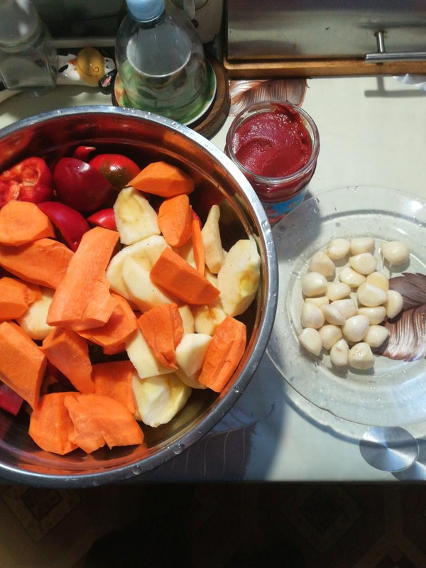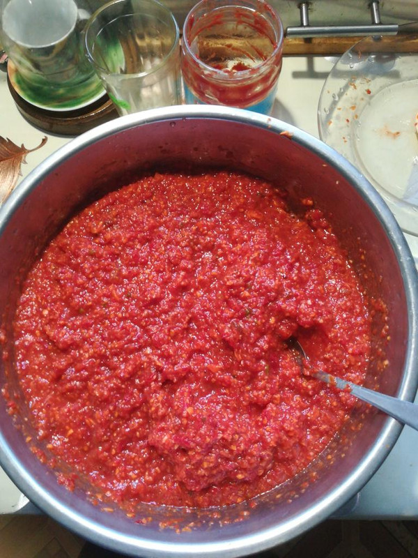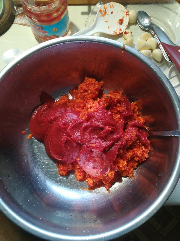 Довольно неплохая аджика получается . Мне понравилась . Сырая аджика самая вкусная и полезная, ведь она сохраняет все ароматы овощей и фруктов, а также витамины, содержащиеся в них. Аджика с томатной пастой получается более нежной и более сочной . Ингредиенты : Томатпаста - 500 г. Гогошары - 1кг. ( можно болг. перец) Морковь - 300 г. Яблоки - 300 г. Чеснок - 300 г. ( можно меньше ). Острый перец - 5 шт. Соль - 2 дес.ложки Уксус - 250 г. ( 6% ) Приготовление . Используем блендер , измельчитель , можно мясорубку . Вкус корректируем . В банки и в холодильник . Вышло 2,5 кг. ![]() ![]() ![]() ![]() Кстати , при помощи аджики можно мариновать мясо / куриные ножки для шашлыка . Пишут : Цитата ...сначала на ночь их в этой аджике мариную,