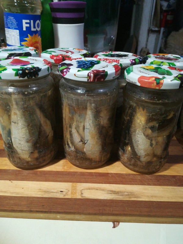 Готовим в автоклаве , или в переделанной скороварке . Рыбка получается вкусной . Рецепты разные , я использовал самый простой . Ингредиенты : рыба салака , соль , перец черный , вода , масло . Рыбу моем , отрываем голову , пальцем вытаскиваем кишки . Отрезаем хвостик ( можно и не отрезать ). Промываем . На 7 баночек х 0,37 пошло 1,5 кг рыбы. В каждую банку 3 горошины перца , кусочек лаврушки , около 1 ч.л. соли . Рыбку в банки . Наливаем воду , пару ложек подсолнечного масла . Крышки в кипяток на минутку . В скороварке готовил : 116-118*С / 90 мин. Затраченное время ( общее ) ~ 3 часа . При такой температуре рыбка становится желтой , вкус приятный , костей нет . Вода сначала как теплоноситель , потом уже бульон . Вкус понравился . Примерная стоимость баночки выходит ~ 0,7 $ . ![]() ![]() ![]() ![]() -------------------- лучшее изобретение человечества - это музыка и интернет !