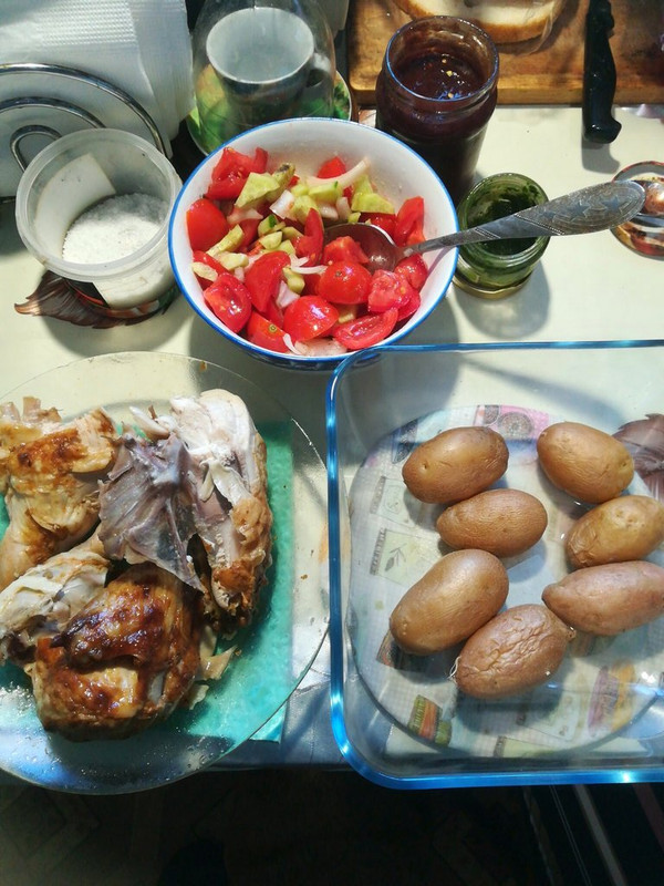 Картофель ( американка ) запек в СВЧ , курица магазинная . Вкусно и быстро . Самому курицу делать , больше хлопот ( время , маринад , энергия ). К мясу : вишневый соус ( очень вкусный ). ![]() -------------------- лучшее изобретение человечества - это музыка и интернет !