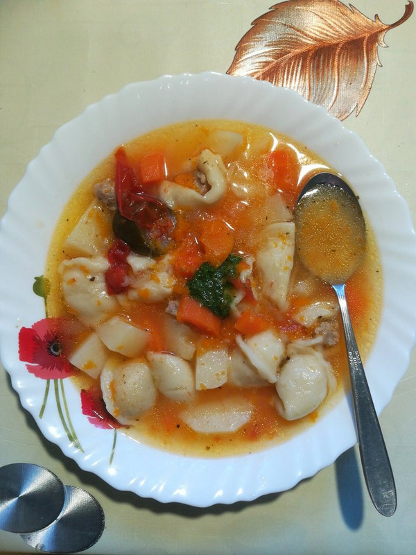 Быстрый и вкусный супчик . Делается в скороварке 24 мин. Ингредиенты : * пельмени ( разрезать пополам ) * тыква * картошка * морковь * лук * соленый огурец * помидор * масло * соль , сахар , перец * зелень Приятного аппетита ! ![]() -------------------- лучшее изобретение человечества - это музыка и интернет !