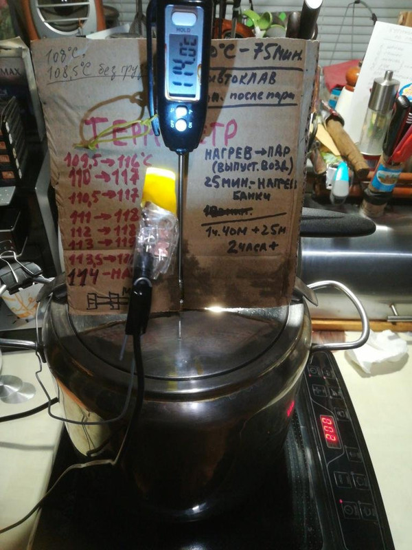 Консервы в скороварке . Куриные шейки - 1кг. Куриные спинки - 1кг. морковь - 1 лук - 2 ( средние ) банки - 7х370 мл. Банки , крышки промыть содой шейки разморозить в СВЧ ( 1кг ) спинки тоже морковь с луком немного обжарить ставим в банку по 2 ст.л. перец , кусочек лавр.листа МЯСО УКЛАДЫВАТЬ ТЕПЛЫМ !!! укладываем шейки укладываем спинки ( немного останется ) оставшееся масло от жарки лука разводим теплой водой и заливаем банки 0,7 ч.л. соли в банку крышки в кипяток закручиваем ставим подставку под банки заливаем теплой водой по плечики нагреваем 25 мин. ставим болт М10 с двумя гайками таймер на 1 час 50 мин. ( В автоклаве индейка / курица по учебникам для советских пищевиков готовится при 114-115 градусах 1 час 50 минут.) Температуру держим 114 - 116*С по термометру . После отключения аккуратно ставим скороварку на поднос , и пусть остывает до 80*С ( примерно 45 мин. ) Вынимаем банки при 80*С ! Получается вкусно ! ![]() ![]() По технологии мясо курицы готовится на заниженной температуре , чтоб не горчило , но увеличивается время экспозиции . Косточки мягкие . ![]() *Скороварка 7л. , переделанная . Толщина стенки 0,85мм Термометр + аварийный клапан . Грузик - болт М10 (50 мм) + две гайки . *Разные модели надо настраивать индивидуально . -------------------- лучшее изобретение человечества - это музыка и интернет !
