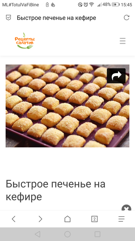 Приготовление очень простое , получаются вкусные печеньки . Ингредиенты: Кефир-100 мл Мука-280 г Сахар-1 ст.л Яйцо куриное-1 шт Пекарский порошок-1 ч.л. ( сода / разрыхлитель ) Растительное масло-50 мл * я бы добавил щепотку соли ![]() Быстрое печенье на кефире https://receptisalatov.com/recipe-921-byist...l?utm_p=pulse_t У нас сегодня не купить нормального печенья , с таким составом . ![]() ![]() ![]() Печеньки можно сделать и солёные . Посыпаем сверху солью перед выпечкой . -------------------- лучшее изобретение человечества - это музыка и интернет !