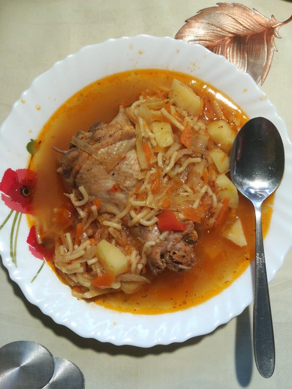 курица картошка вермишель лук квашеная капуста помидоры сельдерей соль сахар специи Суп готовится 25 мин. в скороварке . А когда готовим , загружаем все , что есть . Особенность , раскрытие вкуса за счет поджарки . Лук , помидоры ( из банки ) , сельдерей - немного обжарить . ![]() -------------------- лучшее изобретение человечества - это музыка и интернет !