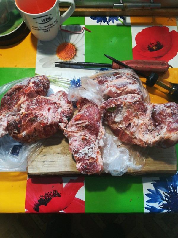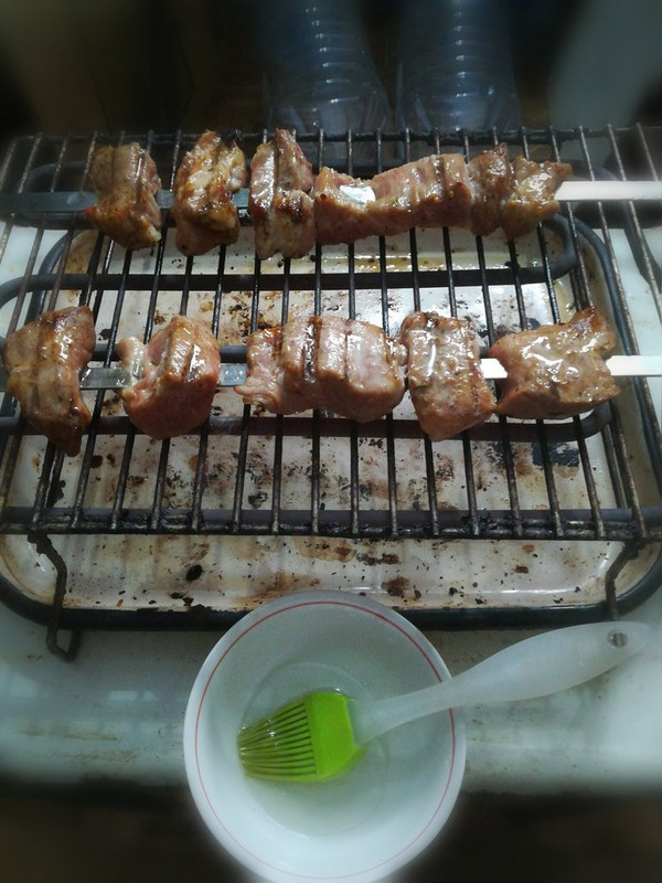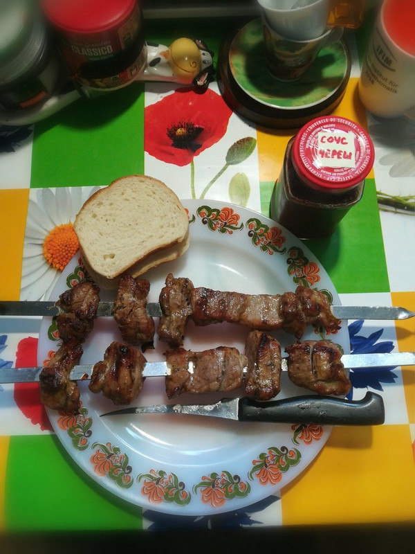 Купил уже замаринованное мясо . Маринад интересный , запах такой . Да и мясо вкусное получилось . Заморозил , разморозил немного мяса в СВЧ . Печка Panasonic , отлично размораживает . ![]() Хотел на улице , но погода ... На электрогриле тоже очень хорошо , термостабильность , не горит . Смазывал раф.подсолнечным маслом с водой . Мясо не сохнет . ![]() Получился вкусный шашлычок . Ещё нашел соус черешневый вкусненький . ![]() -------------------- лучшее изобретение человечества - это музыка и интернет !