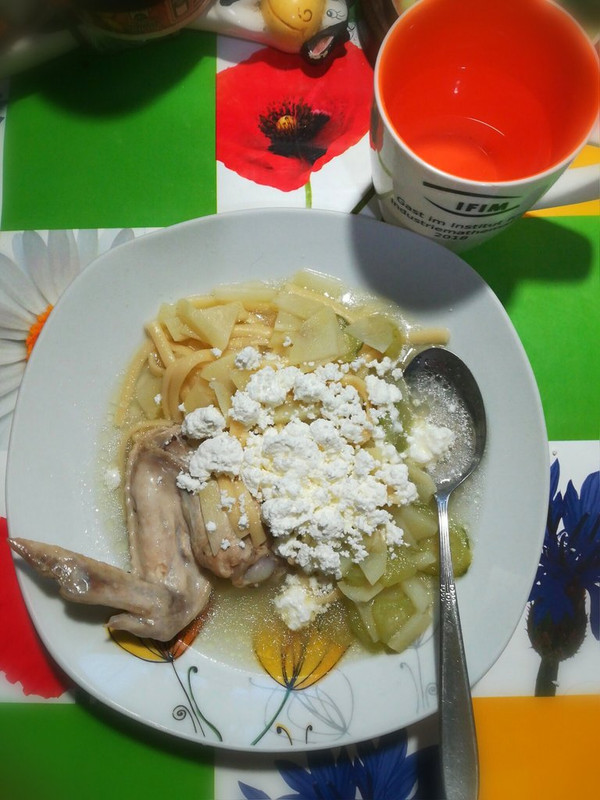 Получается легкий , сытный и вкусный . Можно "играть" вкусовыми оттенками , добавляя разные ингредиенты . Творог дает легкую кислинку . Ещё добавлен замороженный огурец , тоже даёт интересность . Ингредиенты : куриное крылышко итальянская паста Rummo картофель ( токими пластинками ) лук огурец специи готовил в скороварке 25 мин. ![]() -------------------- лучшее изобретение человечества - это музыка и интернет !