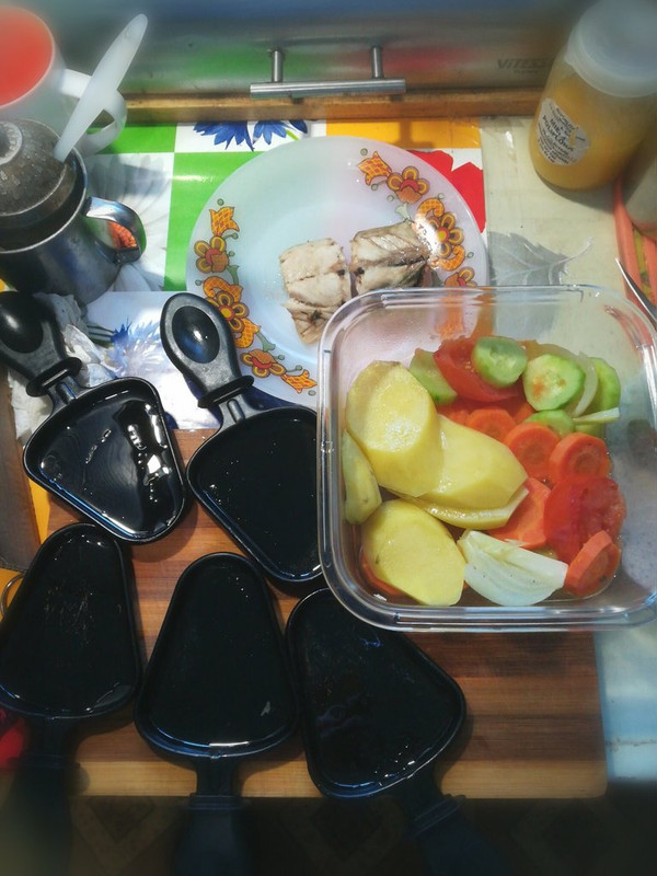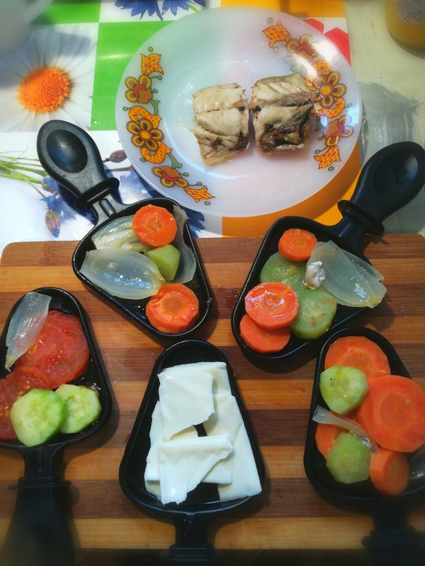 С грилем тоже не всё так просто . В основном , нужна температура уничтожения патогенов + некоторое время . На гриле открытого типа раклетницы не так просто набрать внутри рыбы/мяса температуру , и не пережарить . Даже 80*С это уже проблема . Есть ход . Это СВЧ печь . Размораживаем рыбу/мясо , и после разморозки уходим на приготовление микроволнами . Идёт прогрев всего куска мяса сразу , и температура очень быстро набирается . За 4 мин.на средней мощности имеем почти 100*С ! ![]() Можно убыстрить процесс жарки овощей путем частичного приготовления в СВЧ. Складываем в контейнер + немного воды и на несколько минут в печь . ![]() Потом перекладываем почти готовые овощи в сковородочки раклетницы , смазываем маслом , специями . ![]() На выходе имеем чуть поджареные очень нежные и вкусные овощи . ![]() -------------------- лучшее изобретение человечества - это музыка и интернет !