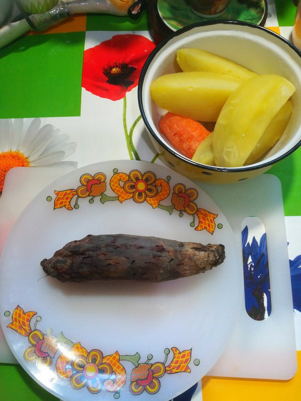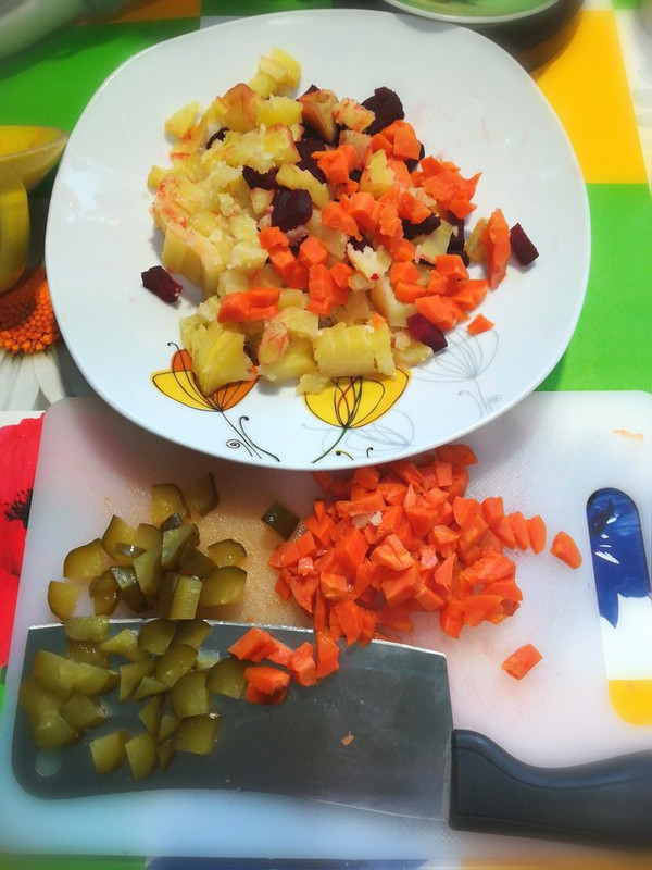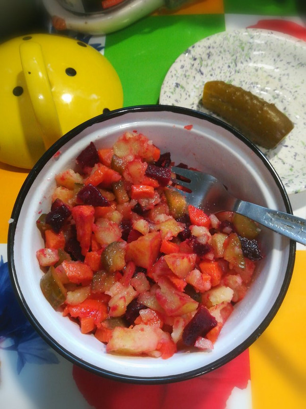 Быстрый , всё готовится в СВЧ печке в специальном контейнере . В СВЧ нагрев происходит всего продукта сразу . Общее время приготовления до 20 мин. Дольше всего варится свекла . Картофель - 1 очистить , порезать на 4 части Морковь - 1 очистить Свекла - 1 с кожурой , проткнуть вилкой Огурец соленый - 1 В этом контейнере на дне вода , тоже забирает мощность . Варим 8 мин., картошка с морковкой готовы . Свеклу ещё минут 5-6 . Режем , складываем в пиалу с крышкой . Поливаем маслом , немного соли , перца . Очень вкусно ! ![]() ![]() ![]() ![]() -------------------- лучшее изобретение человечества - это музыка и интернет !
