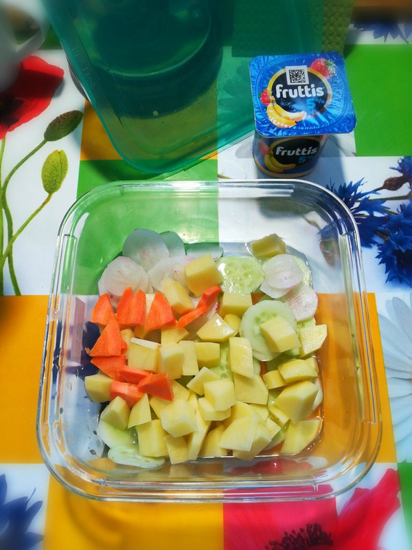 Окрошка на квасе , таратор на йогурте / кефире . Это вариации , направление . Готовится быстро , минут 10 . Ингредиенты : картошка - 1 морковь - 0,5 лук - 0,5 огурец - 1 редиска - 3 соль , перец , зелень Йогурт может быть любой . Овощи режем в судочек , немного воды . Ставим в СВЧ печь , мощность 100% / 7-8 мин. Остудить , добавить йогурт , разбавить водой . Быстро и вкусно . ![]() ![]() -------------------- лучшее изобретение человечества - это музыка и интернет !