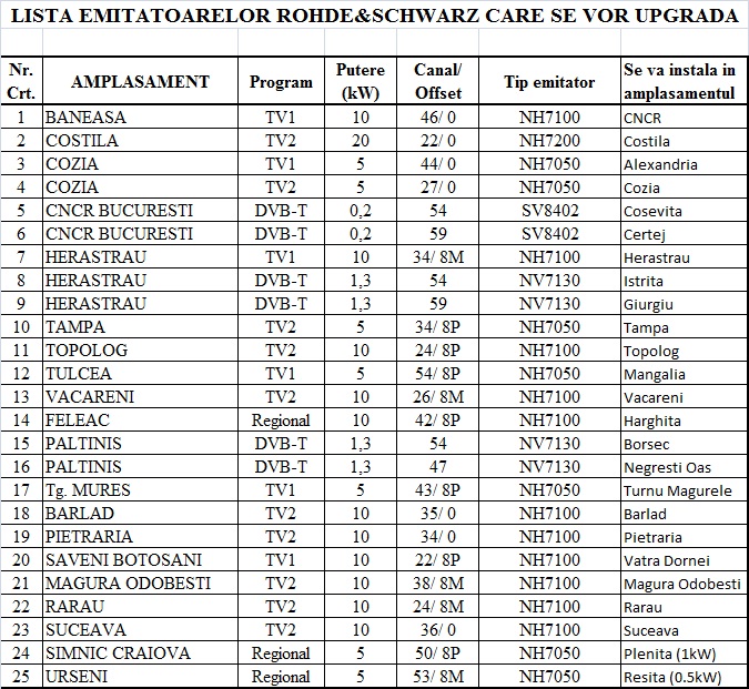 http://www.radiocom.ro/achizitii/Proiect_DVBT/ --> paginile 15 si 16. In plus, puteti regasi o sumedenie de informatii, care pana acum fie nu erau oficiale fie erau ascunse de ochii publicului larg din varii motive: - sisteme radiante (amplasament, putere maxima, diagrama de raditatie, canale utilizate), emitatoare, puteri, etc Iata de exemplu cateva din emitatoarele de mare putere folosite (Harris + Rhode and Schwarz): |