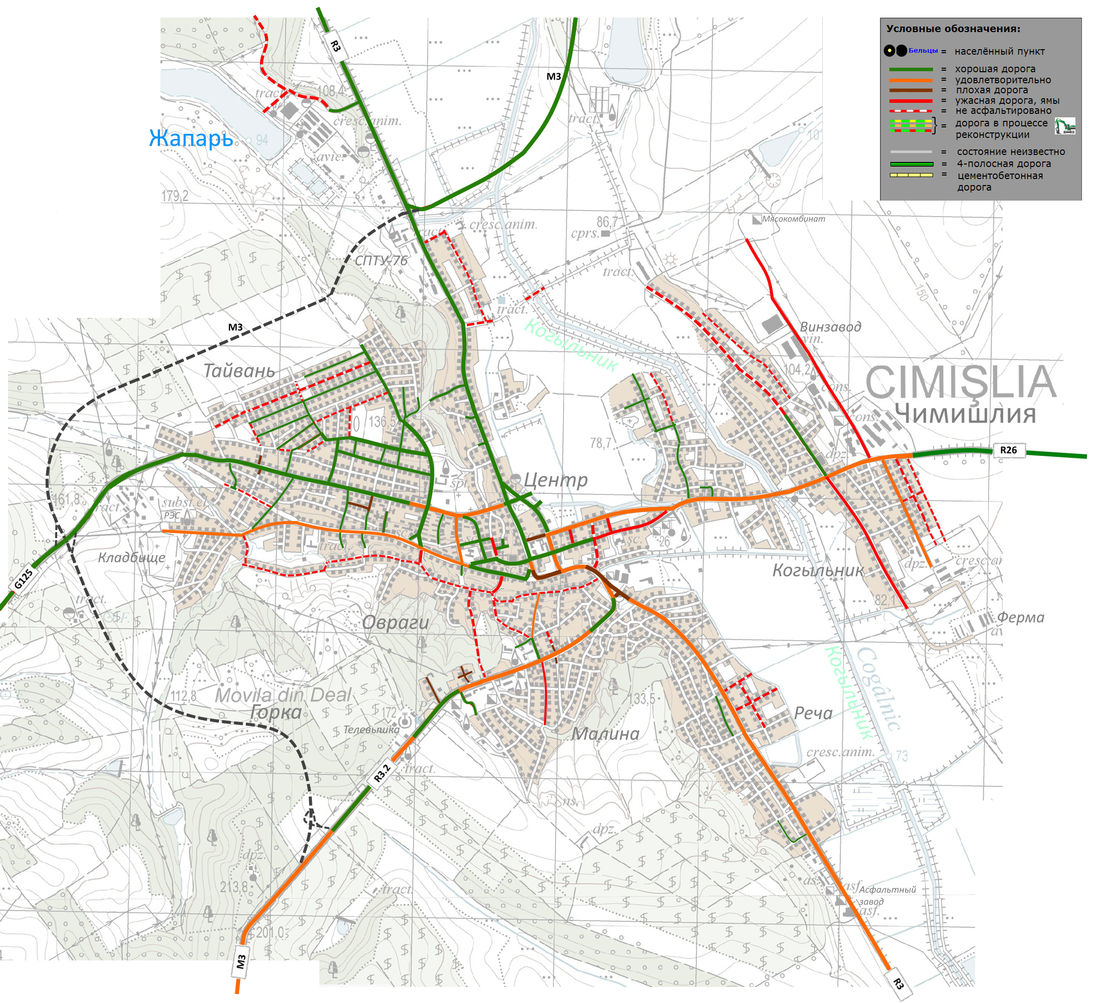 Протяжённость всех улиц города Чимишлия - 70,8 км. Из них 33,6 км или 47% с твёрдым покрытием (щебёнка либо асфальт). Из них около 13 км являются национальными (R3 и R26) либо региональными (G125) дорогами и находятся на балансе госадминистрации автодорог. По материалам с сайта мэрии. Карты состояния дорог в городе Чимишлия. [09-01-2026] ![]() [03-06-2025] ![]() Старые карты состояния дорог Чимишлии: [2024-12-01][13-12-2023][21-07-2021][15-02-2021] [19-12-2020] [30-11-2020] [24-06-2020] [29-08-2019] [17-08-2019] [20-03-2019] [08-12-2018] [26-11-2018] [9-10-2018] [1-07-2018] [12-12-2017] Карта состояния дорог чимишл. района: [25-09-2025] ![]() [01-12-2024] ![]() Архив: [11-09-2023][13-12-2022][15-12-2021][11-10-2021] [19-12-2020] Состояние дорог в сёлах чимишл. района: Албина (L554) [16-01-2021] [26-06-2020] Артемоновка (L562) Батыр (L553) [14-12-2021][30-11-2020] [18-08-2020] [27-06-2020] Старая и Новая Богдановка [22-06-2020] Валя Пержей (R3, G127, G122.1) [10-10-2020] [26-06-2020] Градиште (L599.1, G122.1) [22-04-2022][10-10-2020] [26-06-2020] Гура Галбеней (G123) [14-12-2021][10-10-2020] [20-06-2020] Гыртоп (L558) [26-06-2020] Димитровка (L563) [14-12-2021][24-06-2020] Екатериновка [10-10-2020] [26-06-2020] Жавгур (G127) [30-10-2020] [04-07-2020] Злоти, ж/д станция (G121) [04-07-2020] Кодрень (G121) [04-07-2020] Коштангалия[26-06-2020] Липовены (G123, L557) [29-10-2020] [07-07-2020] Максимены (G127) [04-07-2020] Мариенфельд (G127) [04-07-2020] Мерены (L554.1) [04-07-2020] Михайловка (R26, G122, G124) [26-08-2020] [07-06-2020] Мунтены (L557) [14-07-2020] Новая Ивановка (L555) [29-10-2020] [07-07-2020] Новый Сагайдак (M3, G122) [26-06-2020] Порумбрей (G123, G122.1) [20-10-2021][16-01-2021] [24-06-2020] Присака (L558.1) Сагайдак (G122.1) [08-05-2024][20-10-2021][16-01-2021] [25-06-2020] Сатул Ноу (G122, L560) [22-04-2022][29-10-2020] [18-07-2020] [08-06-2020] Селемет (G122) [22-04-2022][08-06-2020] Скиношика (L556) [14-07-2020] Сурик (L560) [26-06-2020] Топала (L565) [26-06-2020] Троицкое (R26) [14-12-2021][21-08-2020] [24-10-2019] Фетица (L554) [16-01-2021] [28-06-2020] Ченак (G126, L565, L566) [20-10-2021][29-10-2020] [01-07-2020] [08-06-2020] Чукур-Минжир (M3, L565) [16-01-2021] [26-06-2020] Юрьевка (G122.1) [26-06-2020] Ялпуг (L558) [04-07-2020] Ялпужены (G127) [29-10-2020] [04-07-2020] Обозначения и цвета. Синий цвет - свежеотремонтированные дороги (текущий год). Зеленый - хорошее качество асфальтового покрытия. Оранжевый - удовлетворительно: неровности и трещины. Коричневый - плохо: много неровностей и мелких ямок. Красный - отвратительно, много глубоких и широких ям. Красный пунктир - щебёночные дороги. Остальные дороги в Чимишлии либо грунтовые (90-95%), либо состояние пока что неизвестно (5-10%). ------------------------------------------------------------- Последнее обновление - 01.12.2024 |