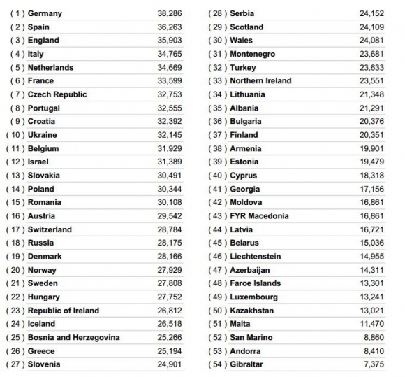 попала в десятку лучших сборных Европы UEFA опубликовала рейтинг сборных, который будет влиять на распределение по корзинам при жеребьевке Евро-2016. За год с небольшим до жеребьевки финальной стадии ЕВРО-2016 чемпион мира сборная Германии вышла на первое место в промежуточном рейтинге УЕФА, но действующие чемпионы Европы испанцы совсем недалеко. Таблица коэффициентов сборных определит, в какие корзины попадут команды при жеребьевке финальной стадии ЕВРО-2016, которая состоится в Париже 12 декабря 2015 года. Поскольку в этом календарном году матчей национальных команд более не предусмотрено, немцы уйдут на зимние каникулы лидерами 38,286 баллами. Лидер прошлого года – Испания - на второй позиции с 36,263 баллами. Третьими идут англичане (35,903), на четвертом месте располагается Италия (34,765), а замыкают пятерку Нидерланды (34,669). Украинская сборная замкнула ТОП-10 с 32,145 баллами. Среди других заметных изменений - взлет сразу на 10 позиций Чехии, которая ныне занимает седьмое место. Израиль с февральского 23-го места взлетел на 12-е, а кроме того, успеха добились Румыния (с 26-го на 15-е), Исландия (с 38-го на 24-е) и Северная Ирландия (с 39-го на 33- е). Самое большое падение в этом году у сборной России, который опустилась на 10 позиций. -------------------- 1. 120cm -90 Е'+85.2 Е'+75 Е'