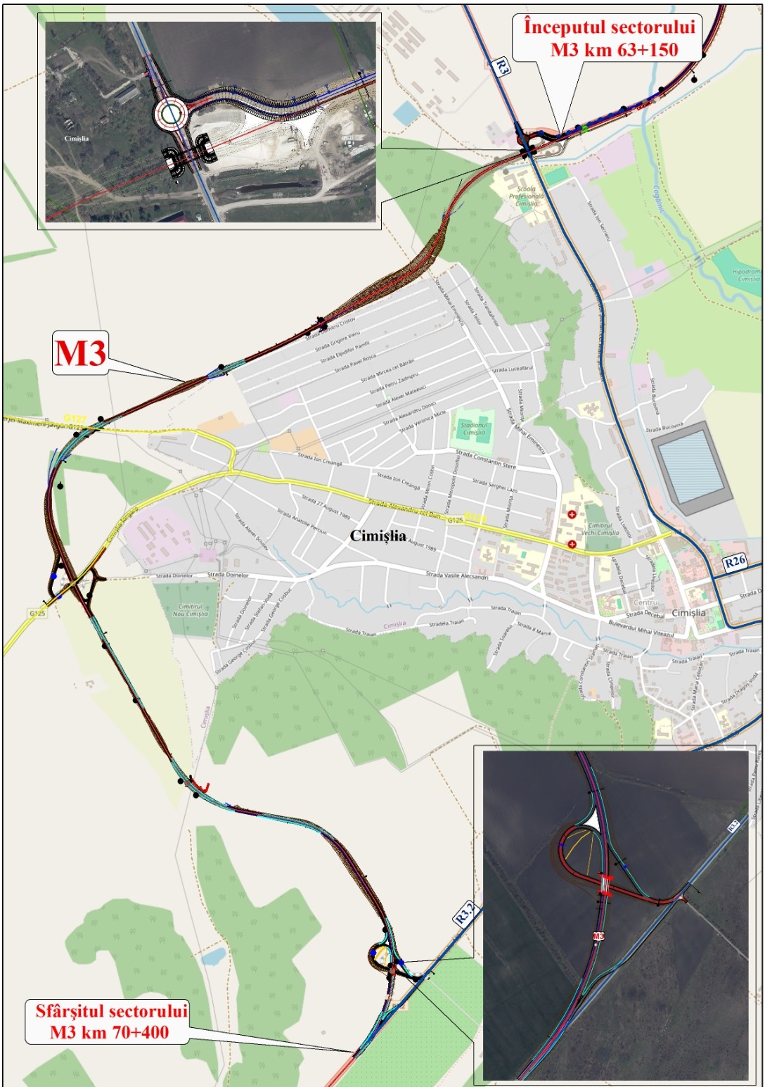 В апреле и марте 2026 года запущен тендер для выбора супервайзера и подрядчика строительства дороги. Согласно первоначальному проекту дорога должна была включать в себя 2 моста через реки и 3 развязки в разных уровнях на пересечениях с 3 трассами R3, G125 и R3.2 (M3). Судя по эскизу 2026 года проект изменён. Меньше мостов. Из 5 мостов сохранили только 2: развязки с трассами на Хынчешты и Комрат. ![]() Цитата Cimişlia bypass will be a 2-lane road with 8 m width and 5 m shoulder. In addition to road construction the construction of five interchanges is foreseen. Объездная Чимишлии будет представлять собой двухполосную дорогу шириной 8 м и шириной обочины 5 м. Помимо дорожного строительства, предусмотрено строительство пяти развязок. Цитата Lucrări de artă: оn conformitate cu proiectul tehnic pe drum sunt prevăzute 2 poduri la km 21+770, km 23+907 și 3 intersecții denivelate la km 18+968, km 22+690, km 25+522; согласно техническому проекту на дороге запланированы 2 моста на км 21+770, км 23+907 и 3 перекрестка в разных уровнях на км 18+968, км 22+690, км 25+522. Ориентировочная стоимость строительства дороги: 36-42 млн евро. [источник] ---------------------------- Последнее изменение - 20.03.2026